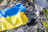 Ukrainian flag and a grenade lying among rubble and ruins, Concept of aggression and war in Ukraine