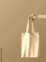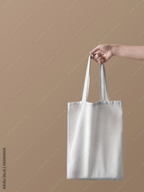 Eco bag. Concept photo with copy space. Girl is holding white canvas bag in her hand against beige backdrop