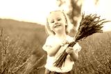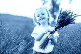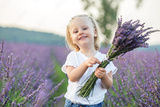 Little girl is walking in lavender field. Smiling kid is holding fragrant bouquet of lavender