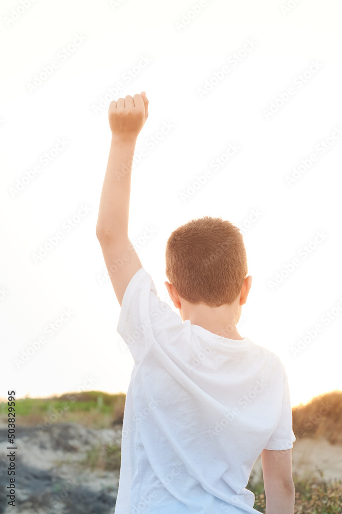 Preteen boy raises his arms in a sign of victory and strength looking towards the sun on a day at the beach dressed in a blue swimsuit and a white t-shirt.