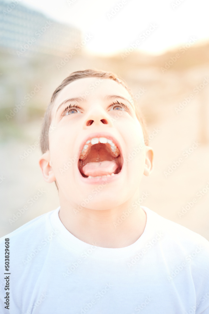 portrait of a preteen boy with his mouth wide open showing his tongue and teeth in a craziness moment. Ten years old kid gesturing with his face. Hyperactivity children concept.