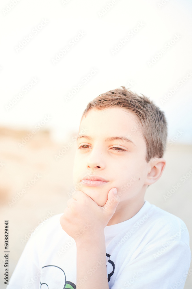 Cute preteen kid thinking and planing portrait outdoors. Ten years old kid gesturing with his face. Children emotions concept.