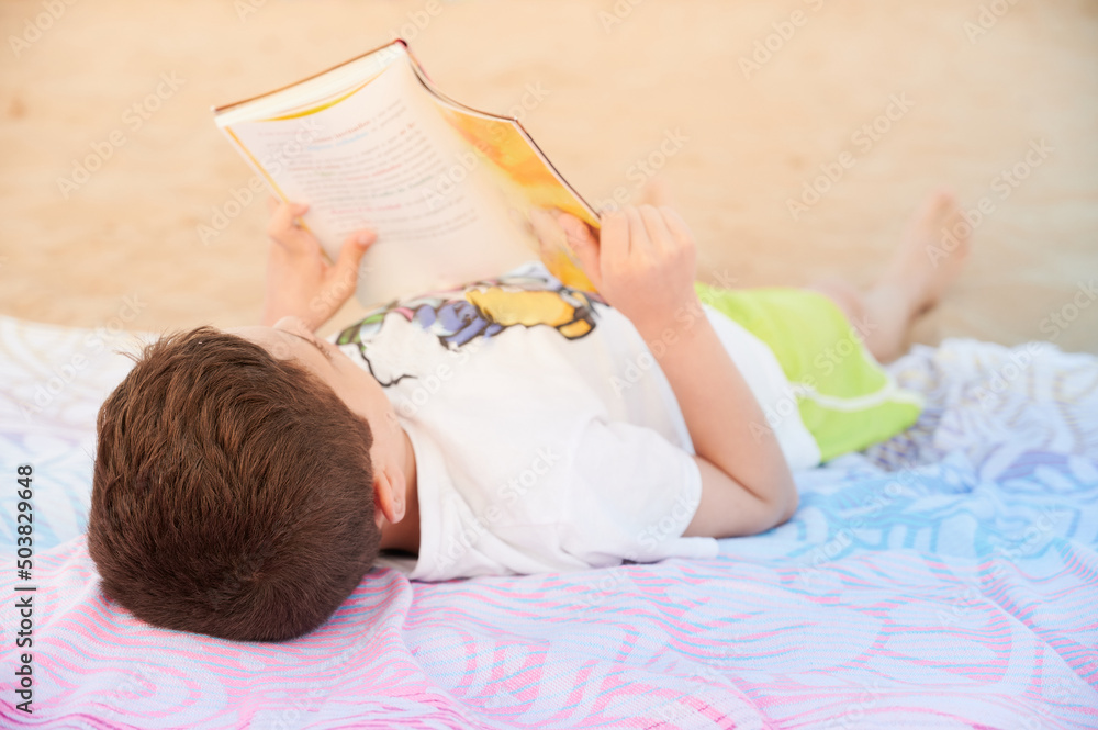 Elementary school age boy lying on a towel at the beach, reads totally focused an adventure book on summer vacation. Summertime lifestyle concept.