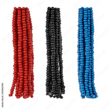 Lots of multicolored threads with black, blue and red beads. Template for designers and advertising isolated on white background
