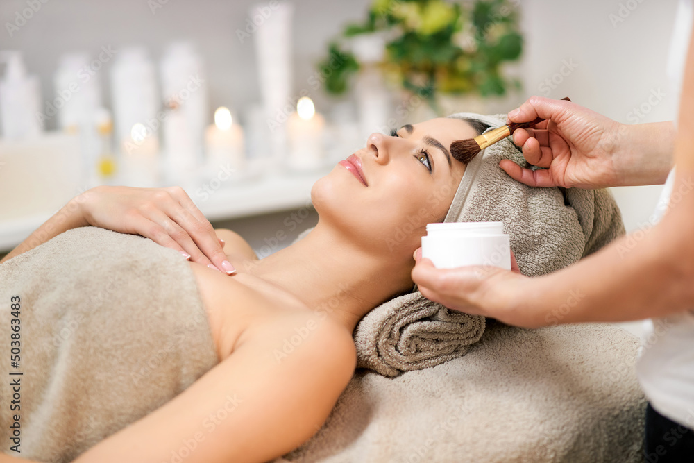 Faceless beautician applying cosmetic product on woman