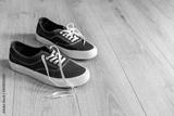 Denim sneakers. Copy Space right. New denim sneakers on the floor.