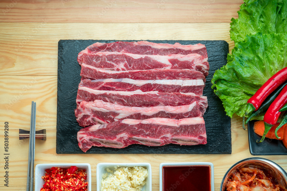 Sliced Cross Cut Short Ribs beef on black plate, Beef Short Ribs (Sliced) on wooden background.