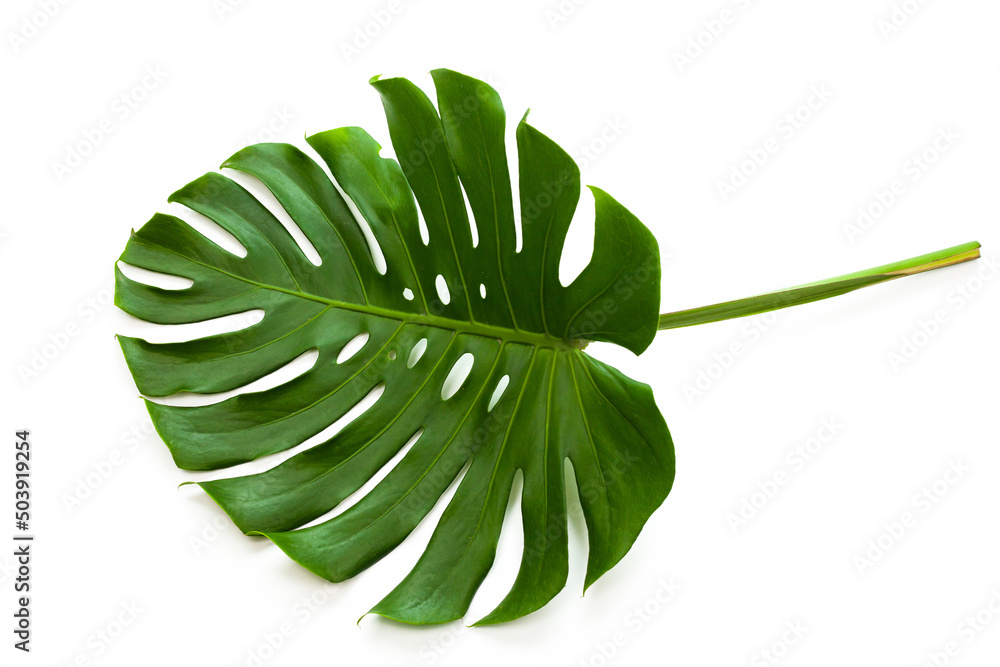 closeup beautiful Monstera leaf isolated on white background, Flat lay