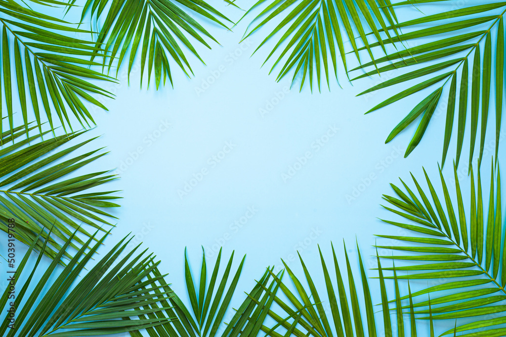 top view of tropical palm leaf on blue color background. minimal summer concept, flat lay, copy space.