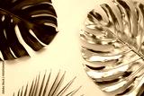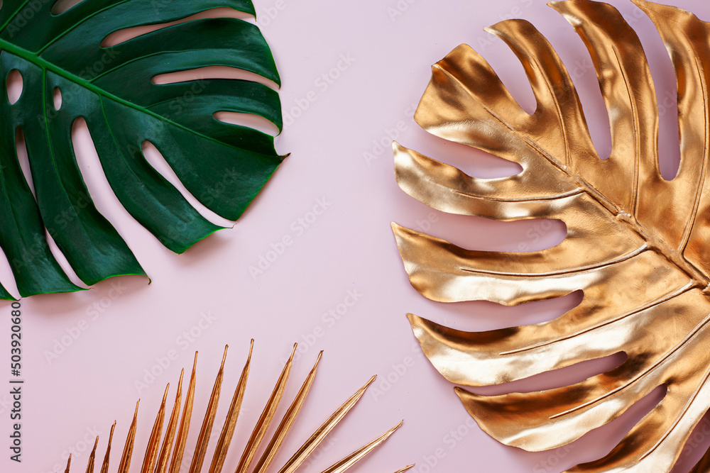 Creative nature layout made of tropical leaves. Summer concept. Monstera leaf on pink background.