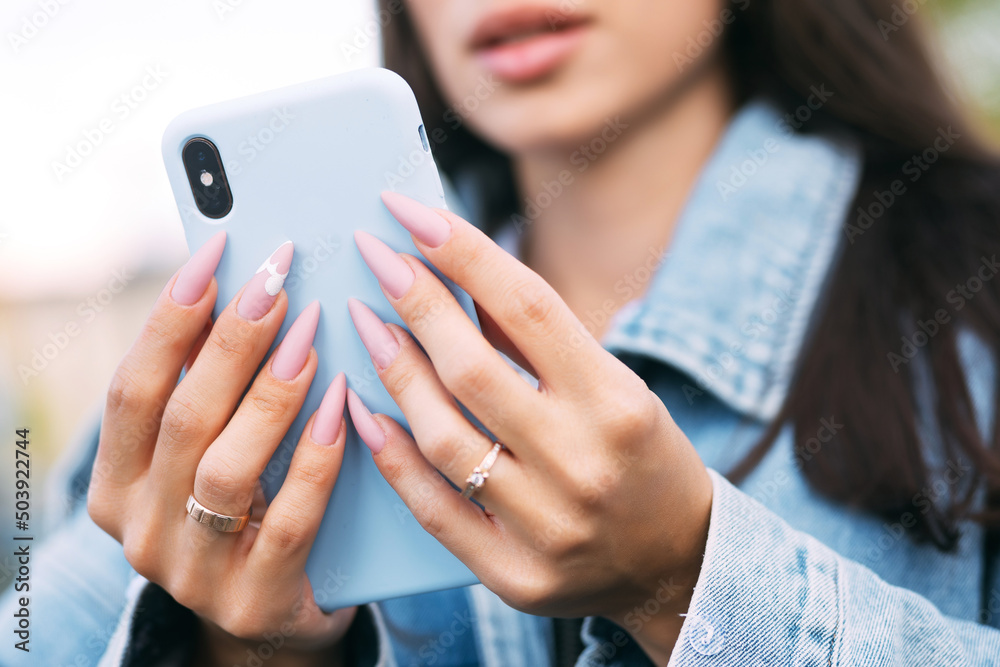 Closeup of modern style pink Nail Polish. Stylish pastel color pink Nails