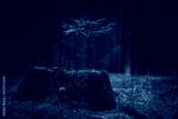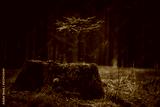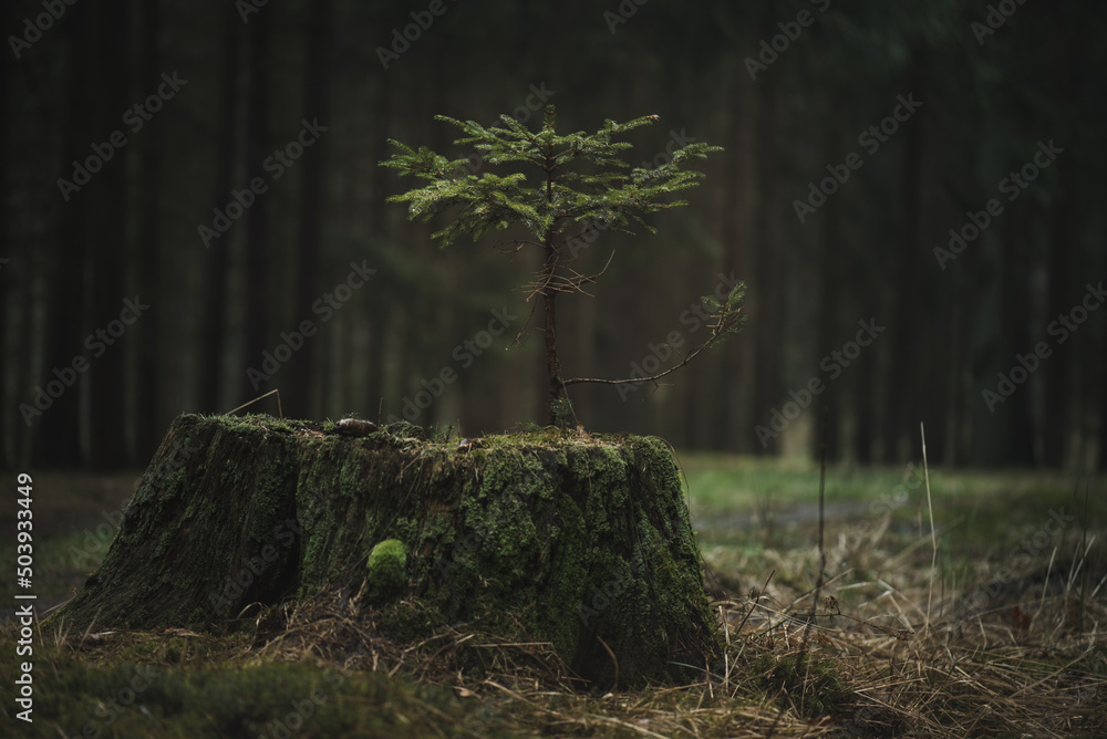 Young spruce seedlings growing from an old tree stump in a dark forest. Rainy weather in Czech forest.
