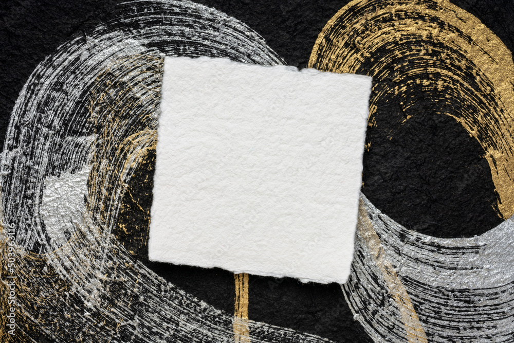 small square sheet of blank white Khadi paper against colorful marbled paper