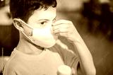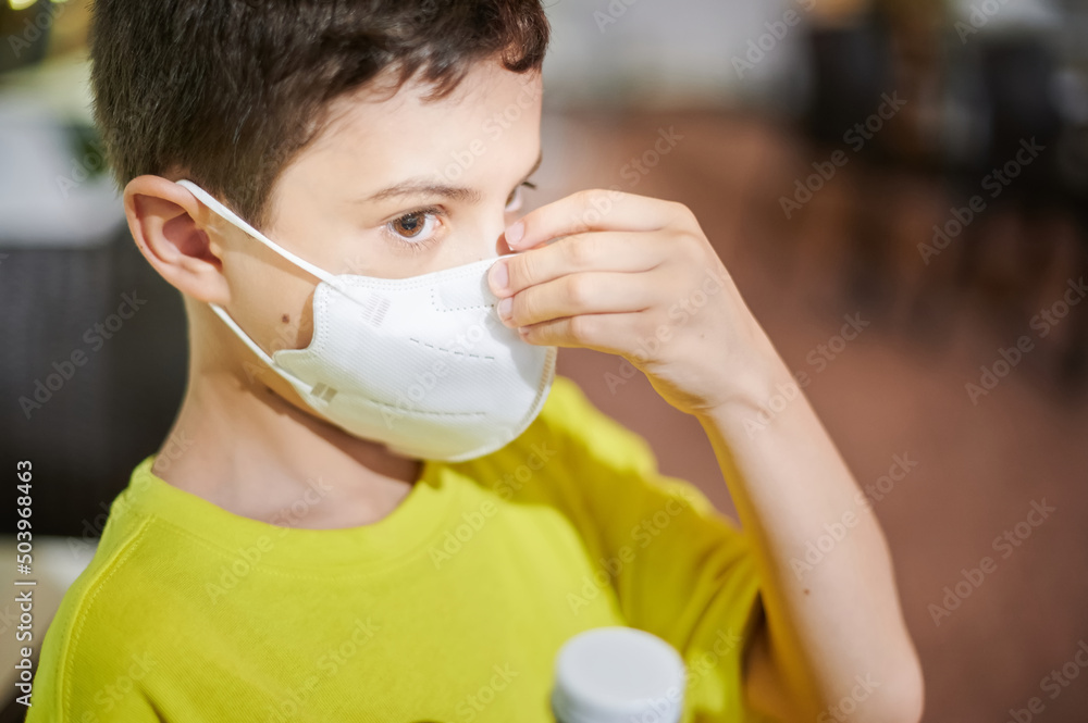 Ten years old kid wearing a colorist shirt adjusts a protective face mask. Summertime concept.