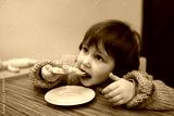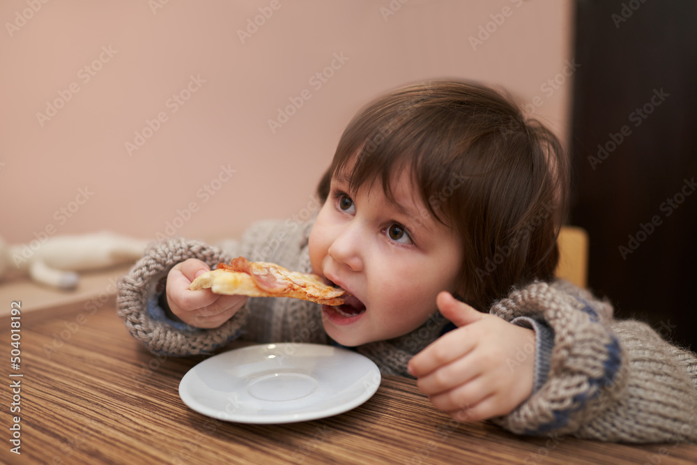 Portrait of a little girl biting off a slice of pizza in a mini restaurant.