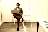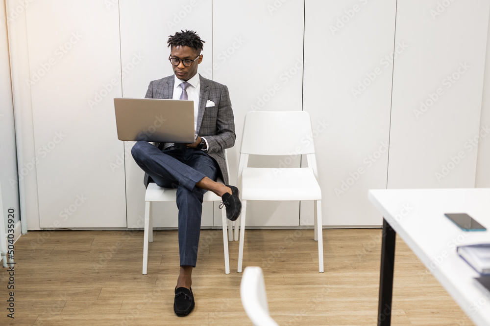 stylish young african man in glasses in office with laptop