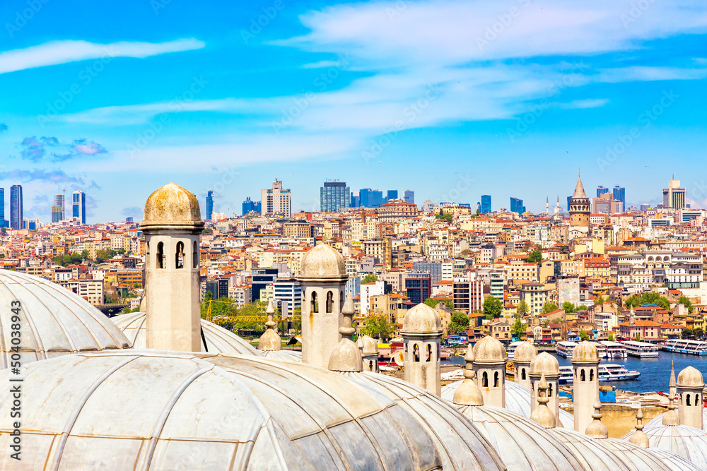 Beyoglu historic district and Galata tower medieval landmark. View from Suleymaniye mosque with towers in Istanbul, Turkey