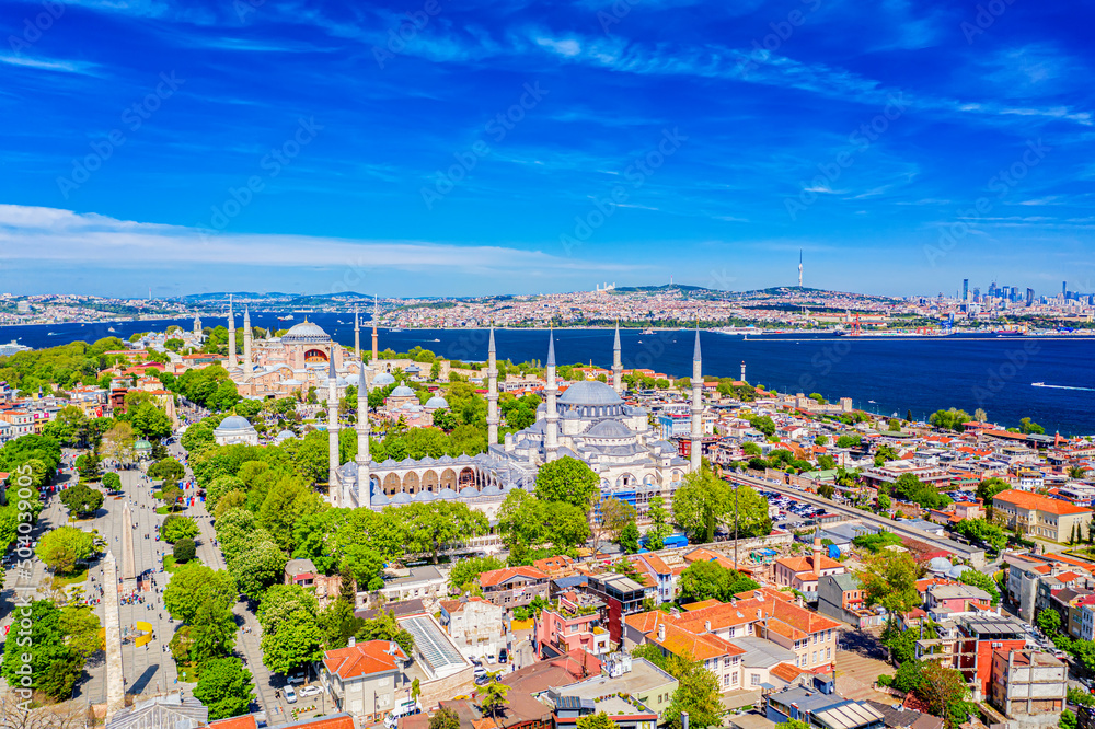 Hagia Sophia and Blue mosque in Sultanahmet district in Istanbul, Turkey. Aerial drone view