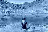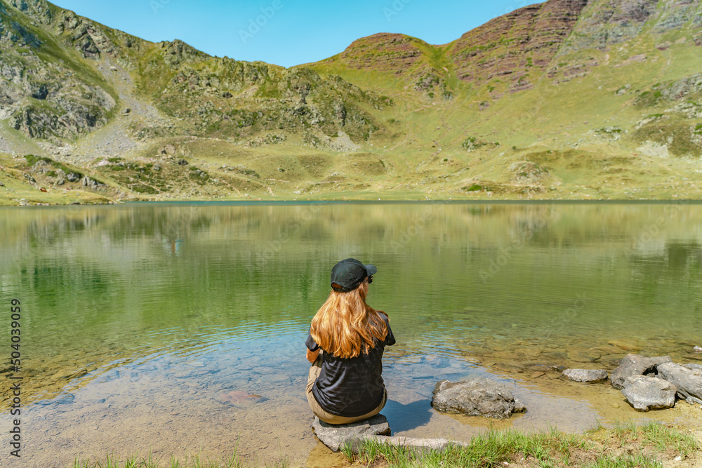 Young Attractive Woman sitting resting in a Beautiful wild Lake Landscape in summer. Discovery Travel Destination Concept.