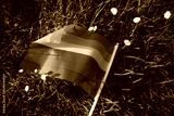 Bright colored LGBT flag in woman's hand against green grass among white blossoming daisy flowers top view. People of non-traditional orientation, gays, lesbians, freedom concept. Pride month in June.