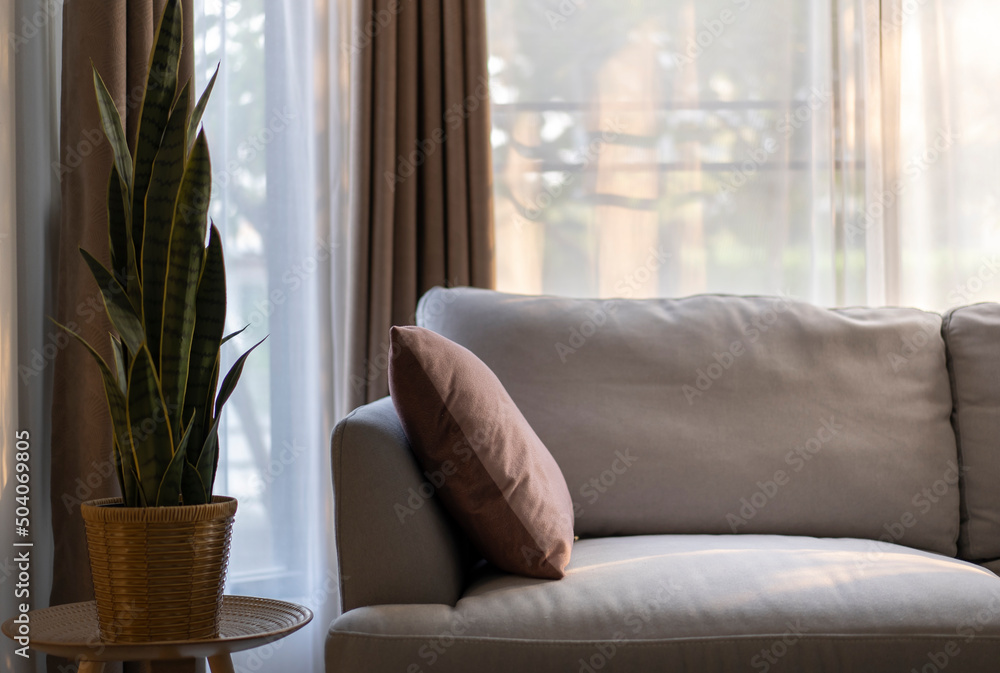 Grey sofa and cushions beside decorate with plant. Lighting from window.