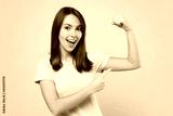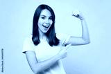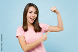 Young happy woman 20s in pink t-shirt showing point index finger on biceps muscles on hand demonstrating strength power isolated on pastel plain light blue background studio. People lifestyle concept.