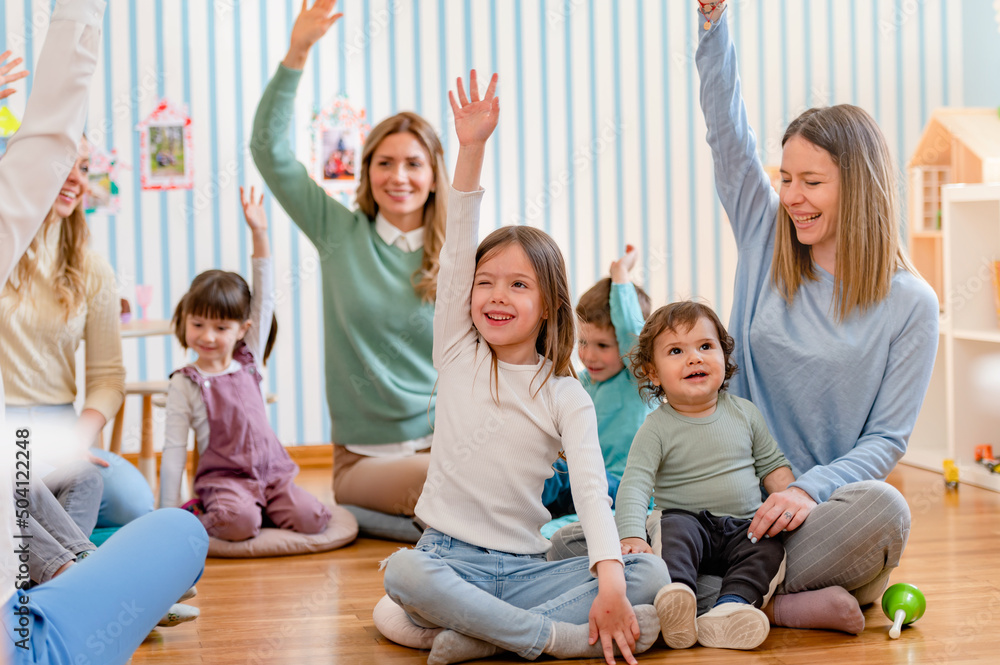 Parents taking part in the activities for preschool children. Healthy learning environment. Teacher and parents working together.