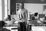 Portrait of smiling african american young male teacher standing by multiracial elementary students