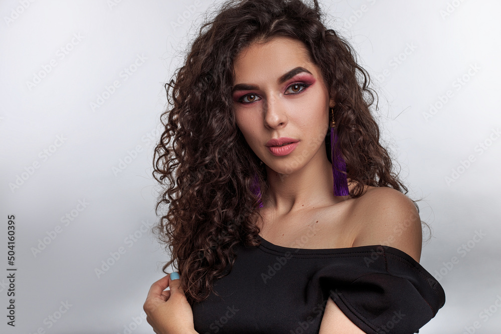 Romantic pretty middle eastern female model with long dark curly hairstyle professional makeup and accessories posing in studio on the white background. Young woman in black dress looking at camera