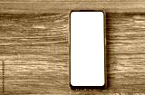 Smartphone with white blank screen on wooden surface with copy space,top view