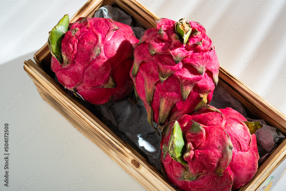 Three juicy ripe Thai whole pitahaya or dragonfruit in a wooden box on a white background.