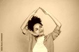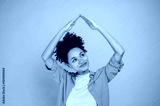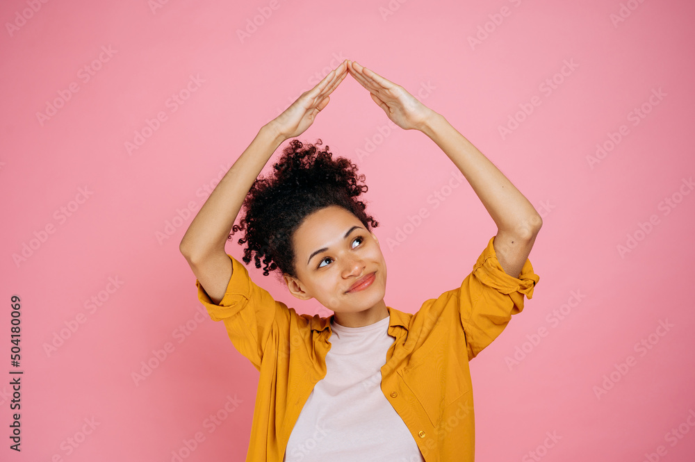 Happy african american curly haired girl in casual clothes, is feeling safe, making roof of hands above head, looks up and smiling, dreaming of home, standing on isolated pink background