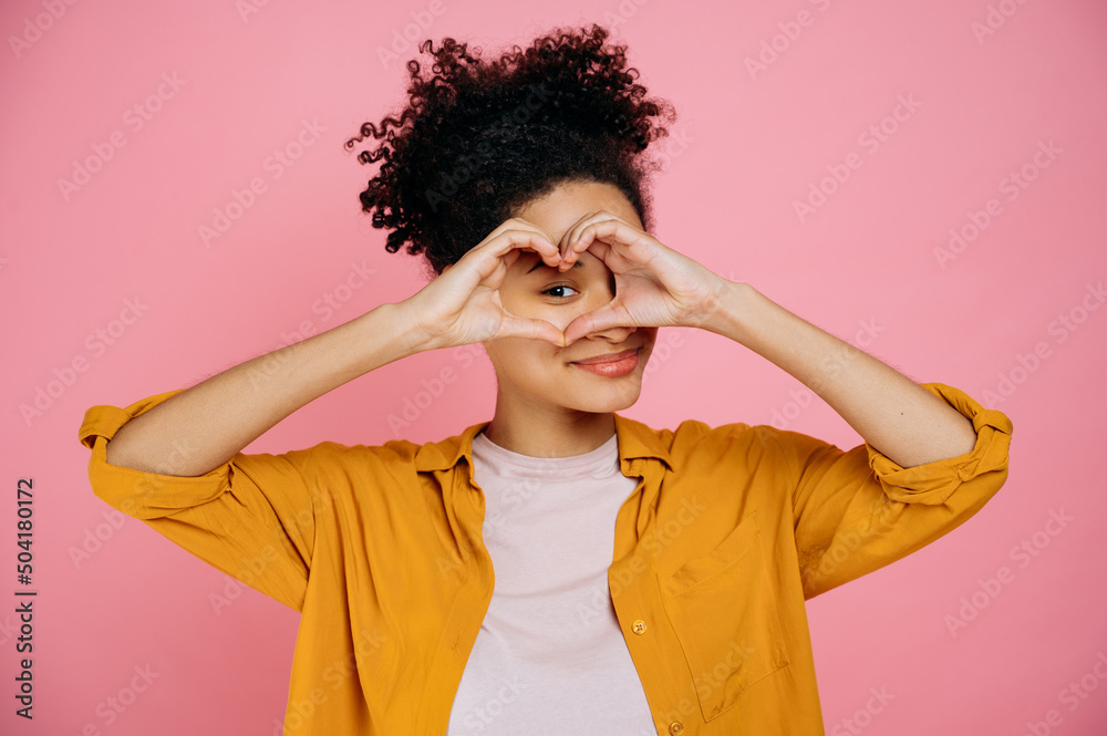 Lovely candid pleasant african american girl, makes heart gesture with hands near eye, demonstrates love sign, stands on isolated pink background, looking at camera though love gesture, smile friendly