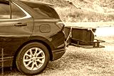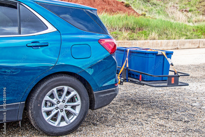 Blue hatchback car parked on gravel with hitch cargo carrier holding tied down rubber storage box on back - Closeup and cropped