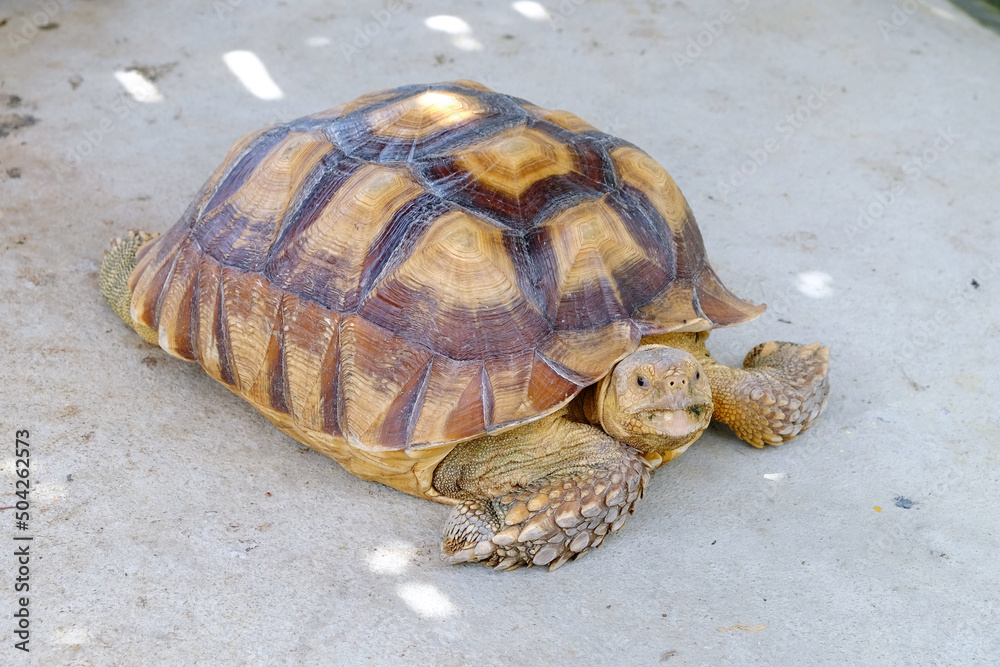 Giant tortoise padded legs with elephantine toenails on cement floor