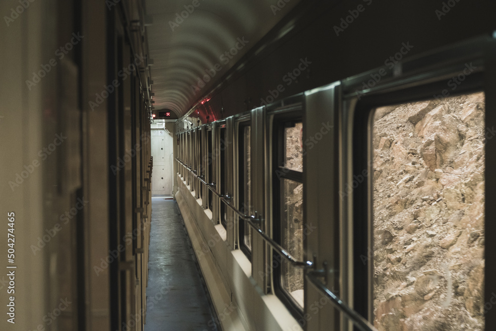 Inside view of a train with no people and windows.