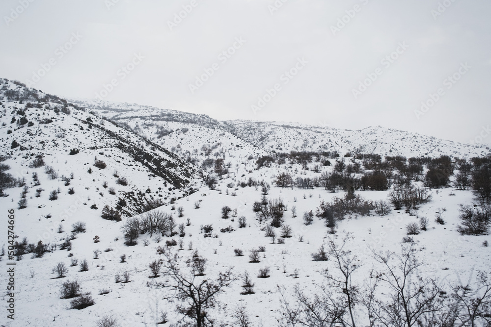 Landscape View of snowy mountains and hills from train trip and in central anatolia.