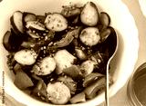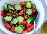 Sliced tomatoes and cucumbers in a plate for morning meal. Top view of traditional Turkish breakfast ingredients with thyme and olive oil. Summer vegan food.