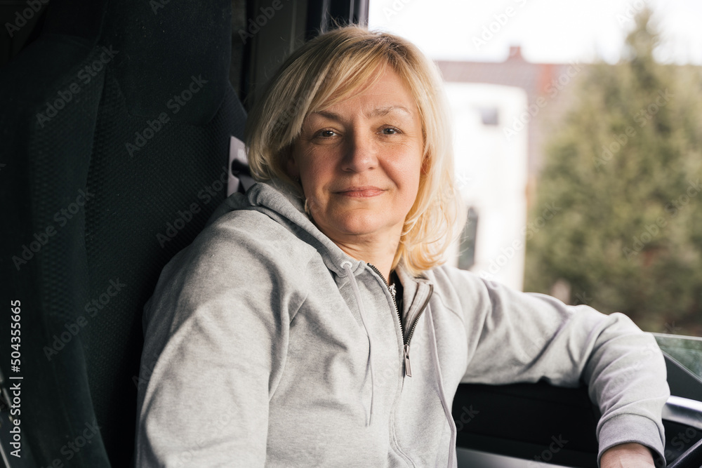 Caucasian mid age woman driving truck. trucker female worker, transport industry occupation