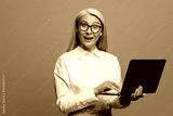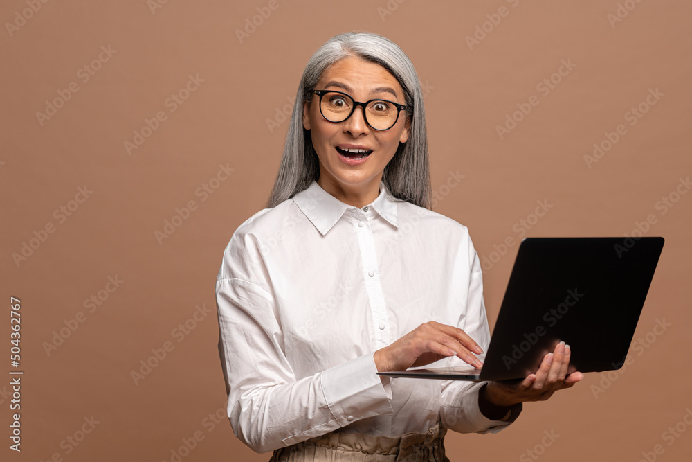 Portrait of smiling worker, happy woman in formal shirt holding laptop, using computer for job, browsing internet with surprised face. Indoor studio shot isolated on beige background