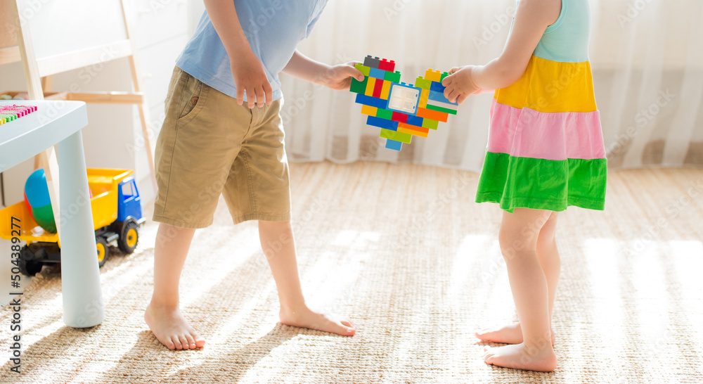 A boy and a girl are holding a heart made of plastic blocks. Brother and sister have fun playing together in the room.