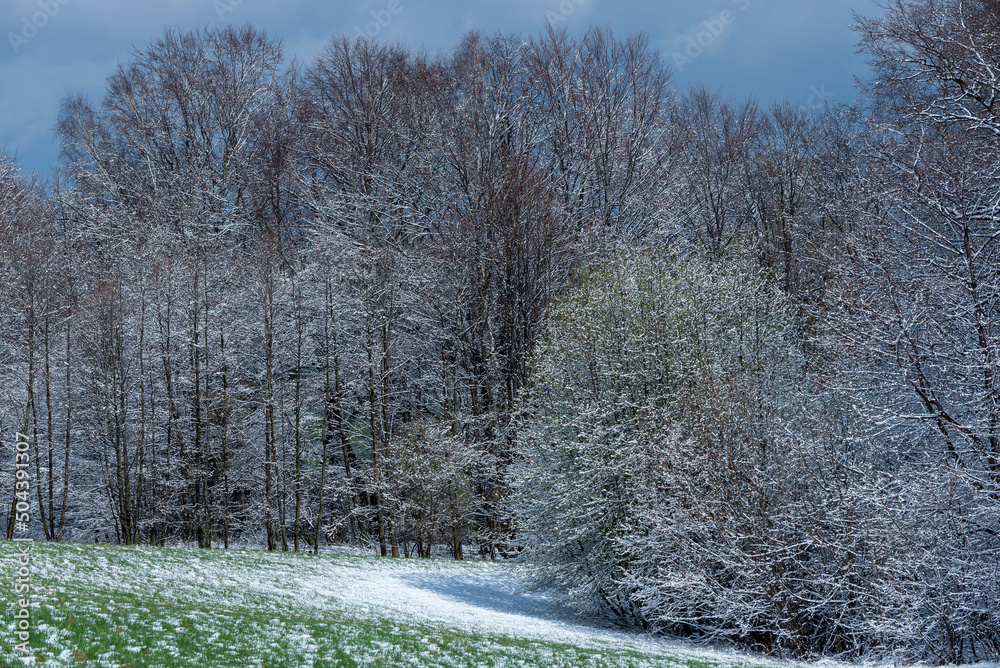 Łąka pod lasem po przejściu burzy śnieżnej, trawa, drzewa, śnieg i chmury.