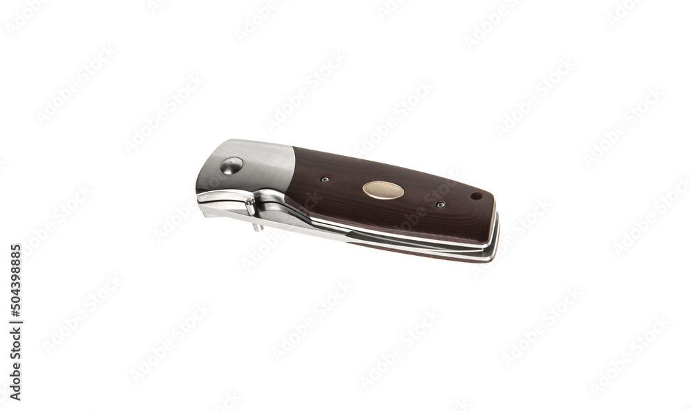Pocket knife with wooden handle. Folding knife with metal clip. Jackknife. Isolate on a white back.