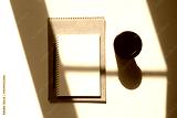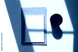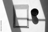a glass of coffee and a notepad with a pen. craft notepad with pen and cappuccino in sunlight on a white background with beautiful shadows.