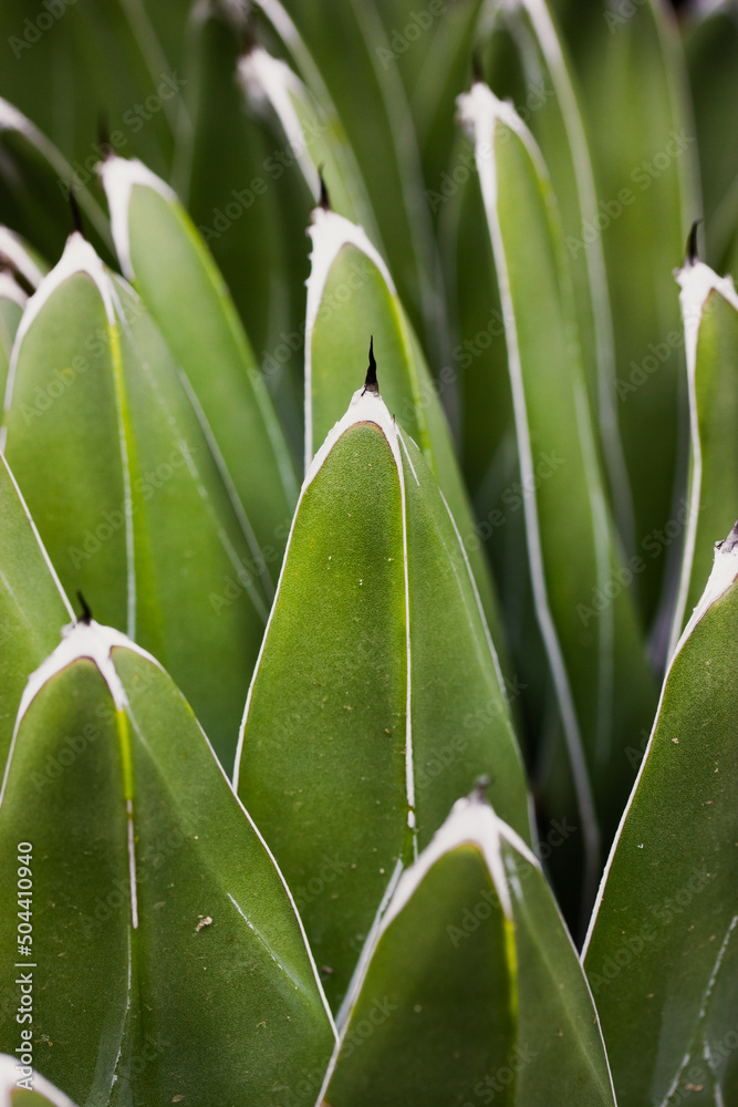 Beautiful Queen victoria agave. Cacti succulent with green smooth long leaves, a scarlet-like plant in a botanical garden greenhouse, plantation in Mexico. Vertical wallpaper with succulents in Mexico