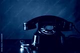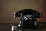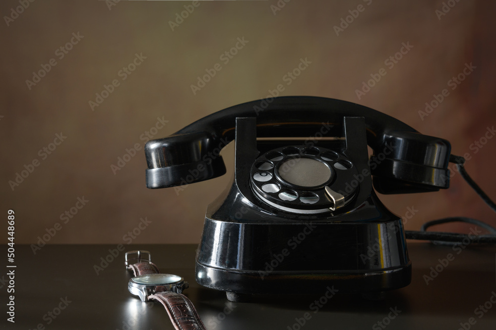 A wooden table with an old telephone set and wristwatch. Vintage concept