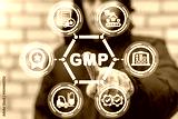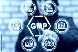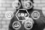 GMP Good Manufacturing Practice Standards Concept. Industrial Practices Quality Assurance Education. Engineer or worker using virtual touchscreen push GMP abbreviation.