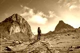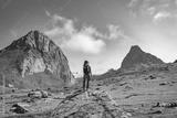 Young Woman With A Backpack on The Top Of a rock in a Beautiful wild Landscape. Discovery Travel Destination Concept
