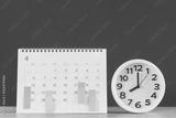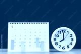 close up of calendar and alarm clock on the wooden table with blue background, planning for business meeting or travel planning concept
