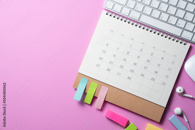 close up of calendar and computer keyboard on the pink table background, planning for business meeting or travel planning concept